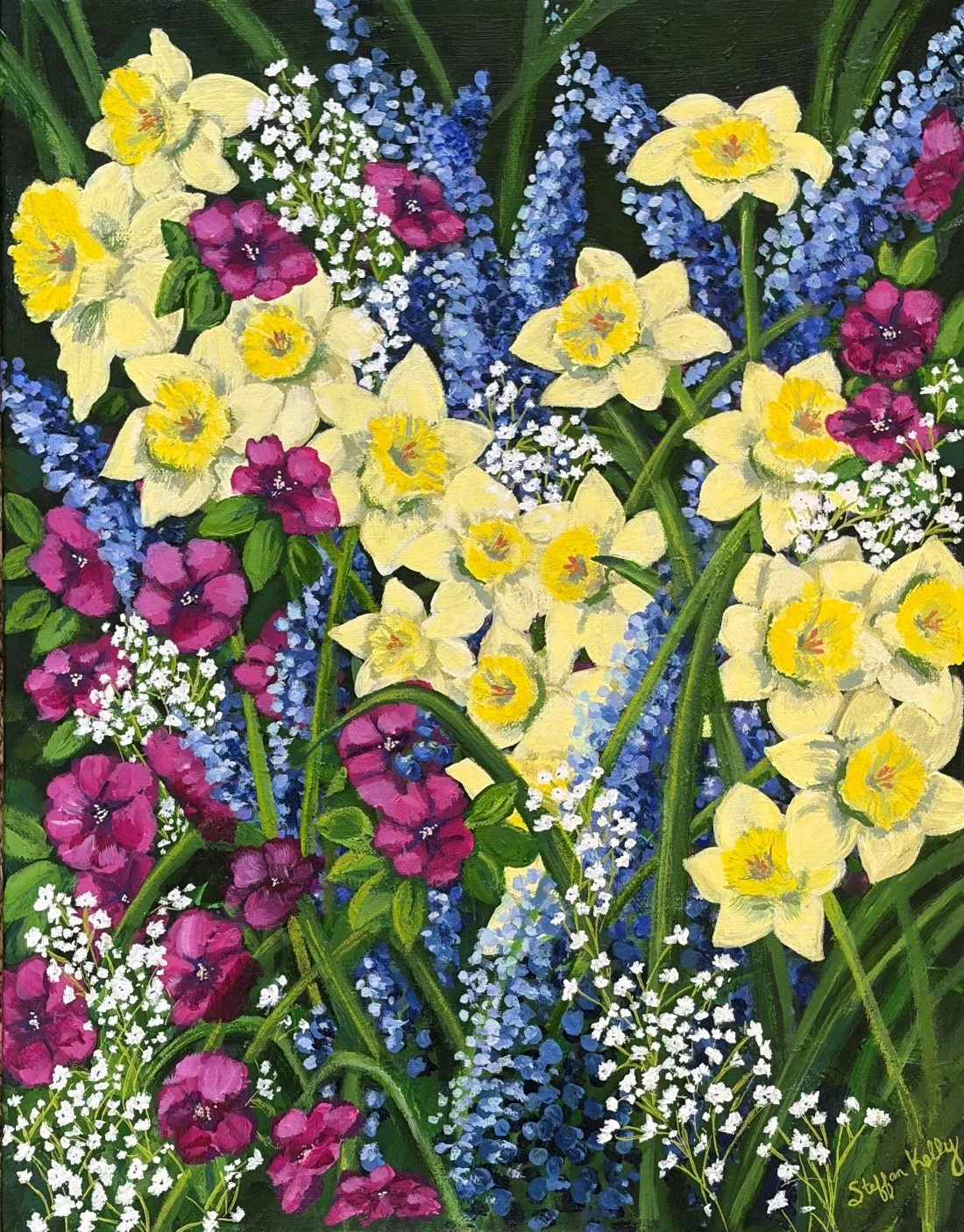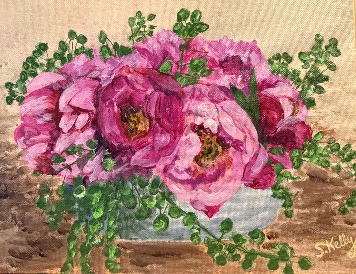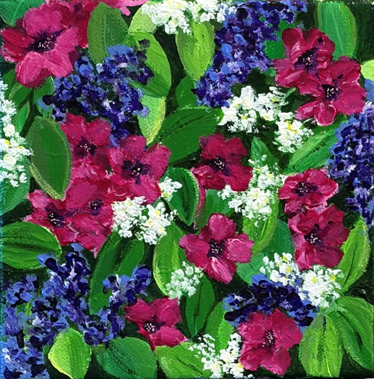 A painting collection built around lush, colorful floral subject matter that radiates energy and abundance. Each piece bursts with layered petals, saturated hues, and organic movement, creating a sense of gardens caught at their most vibrant moment.